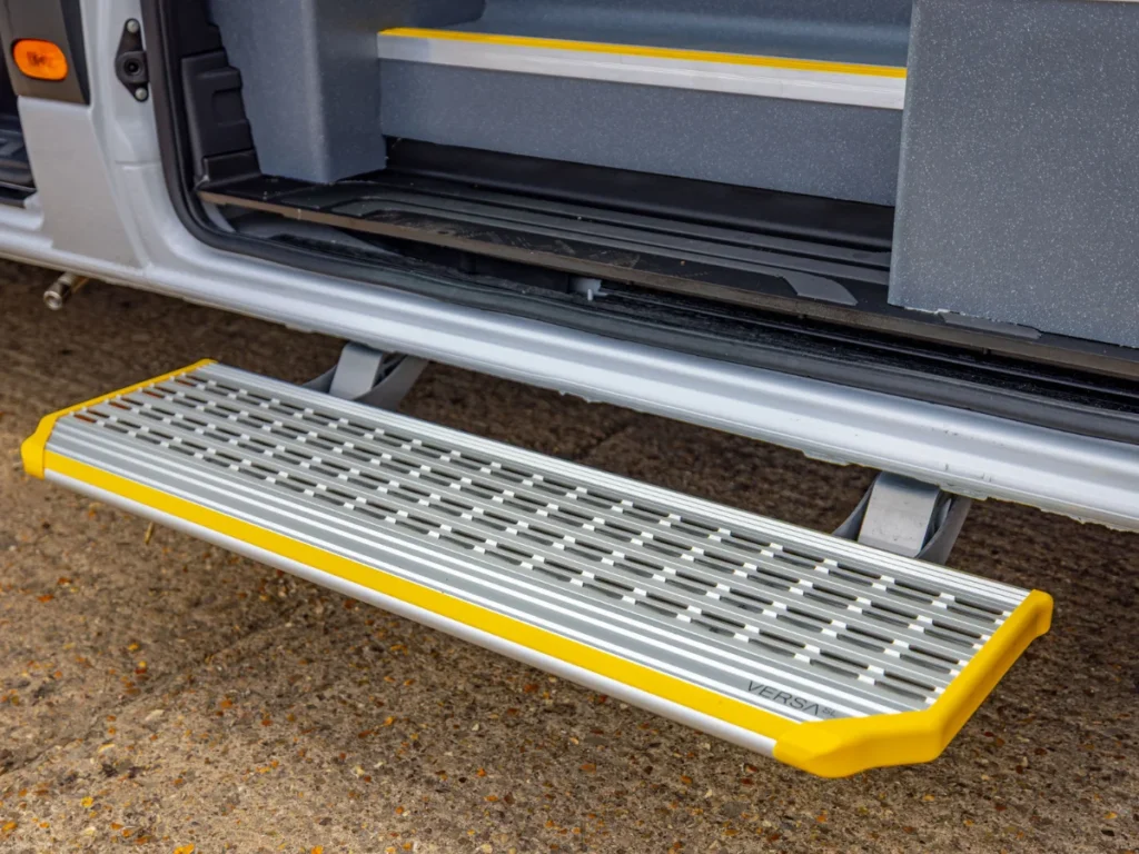 Options include passenger lifts (in-board or underfloor cassette), larger windows for improved visibility (tinted to OEM specification), an automatic side step, and practical touches such as a rooflight and overhead rails.