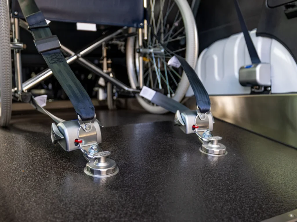 Four-point securement with a lap/diagonal belt keeps the wheelchair and occupant firmly in place. Electric, self-tensioning retractors maintain constant hold and speed up loading, with quick-release hooks for fast departure. L-Track mounting and optional visual/audible belt-warning support safe, repeatable operation.